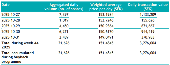 Between 27 October 2025 and 31 October 2025, Betsson AB (publ) (“Betsson”) has repurchased in total 21,626 own series B shares (ISIN: SE0022726485) as part of the share buyback programme initiated by the Board of Directors on 24 October 2025.