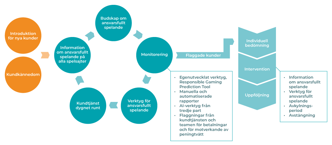 Koncernen har en omfattande process för kundkännedom, och Responsible Gaming-teamet har även ett nära samarbete med andra kundnära team, såsom teamen för betalning och motverkande av penningtvätt samt kundtjänsten.