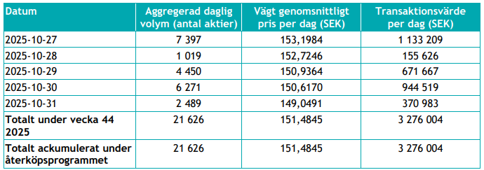 Mellan den 27 oktober 2025 och den 31 oktober 2025 har Betsson AB (publ) ("Betsson") återköpt sammanlagt 21 626 egna aktier av serie B (ISIN: SE0022726485) inom ramen för det återköpsprogram som styrelsen initierade den 24 oktober 2025.